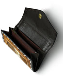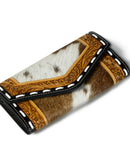 The handcrafted tooling is complemented by a white braiding on the flap, enhancing the aesthetic appeal. The front flap, featuring a snap closure, adds a layer of security to the wallet, while the Antique Brass Puller with CFC Chain YKK provides a vintage touch.