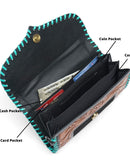 Hand Tooled Carving Wallet Clutch Phone Case Stylish Multi Uses Cowhide Fur Leather Wallets Turquoise Color Wallet for Women